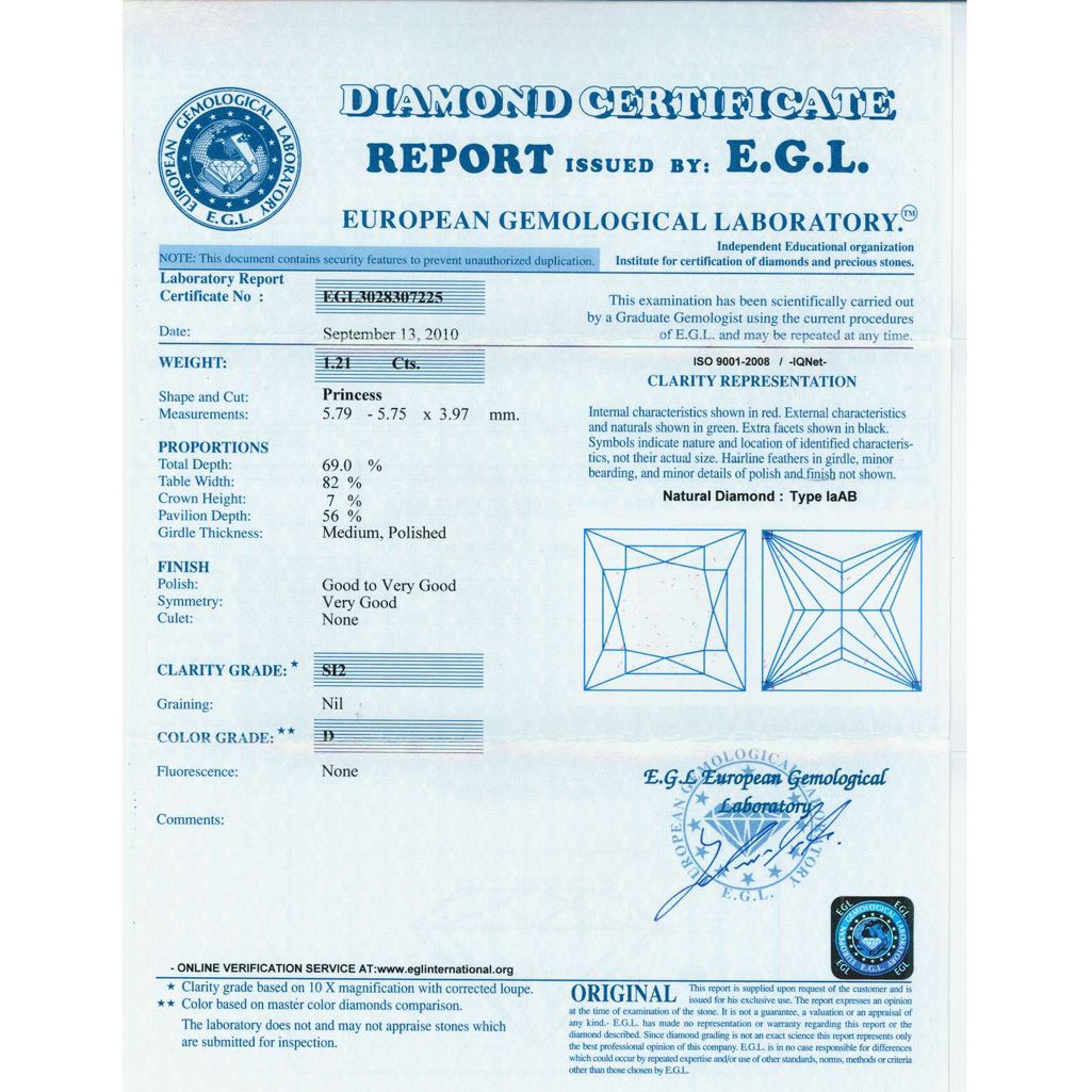 Diamond EGL Certified Princess 1.21 ctw D, SI2 **|**|** 5.79x5.745x3.97mm;Cut Very Good; Polish Very Good; Symmetry Very Good; Fluo None; Depth 69%; Table 82% ; MSRP: $11084