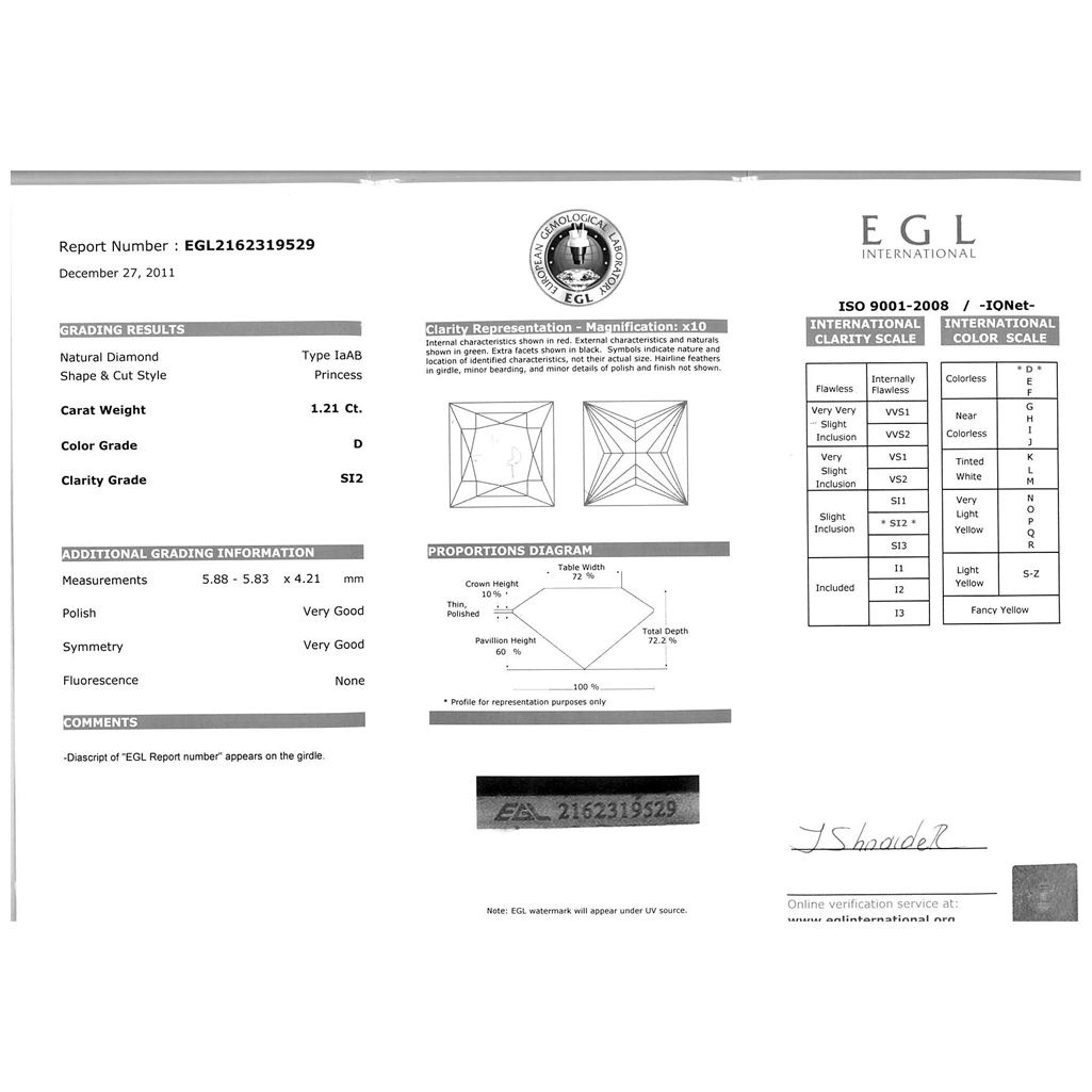 Diamond EGL Certified Princess 1.21 ctw D,SI2 **|**|** 5.86x5.83x4.21mm;Cut Very Good; Polish Very Good; Symmetry Very Good; Fluo None; Depth 72.2%; Table 72% ; MSRP: $11568