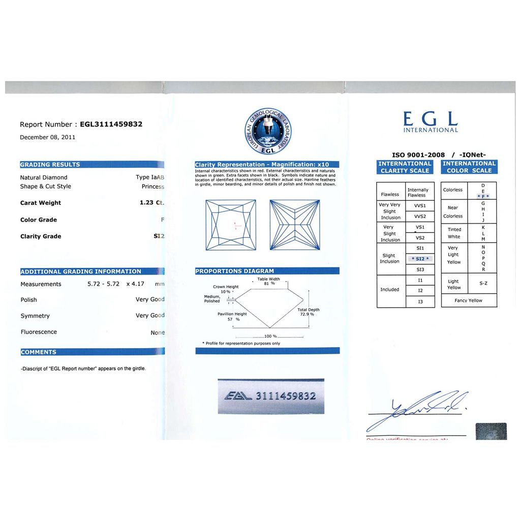 Diamond EGL Certified Princess 1.23 ctw F, SI2 **|**|** 5.72x5.72x4.17mm;Cut Very Good; Polish Very Good; Symmetry Very Good; Fluo None; Depth 72.9%; Table 81% ; MSRP: $10824
