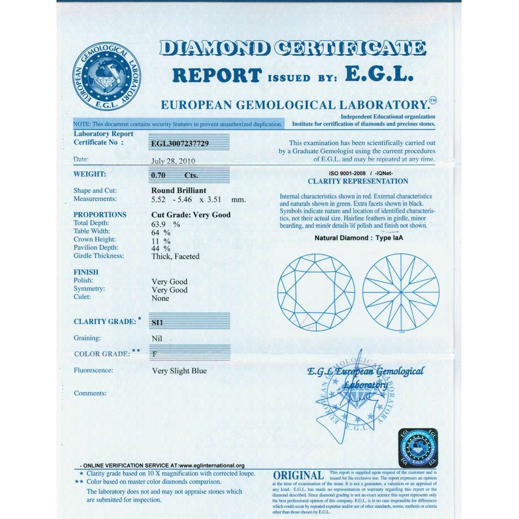 Diamond EGL Certified Round 0.70 ctw F,SI1 **|**|** 5.52x5.46x3.51mm;Cut Very Good; Polish Very Good; Symmetry Very Good; Fluo None; Depth 63.9%; Table 64% ; MSRP: $5872