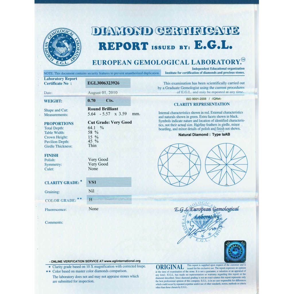 Diamond EGL Certified Round 0.70 ctw H,VS1 **|**|** 5.64x5.57x3.59mm;Cut Very Good; Polish Very Good; Symmetry Very Good; Fluo None; Depth 64.1%; Table 58% ; MSRP: $6272
