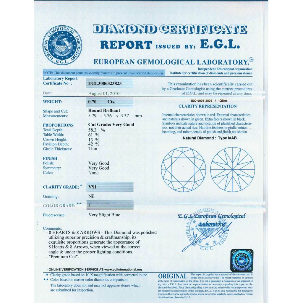 Diamond EGL Certified Round 0.70 ctw I,VS1 **|**|** 5.79x5.76x3.37mm;Cut Very Good; Polish Very Good; Symmetry Very Good; Fluo Very Slight Blue; Depth 58.3%; Table 61% ; MSRP: $5644