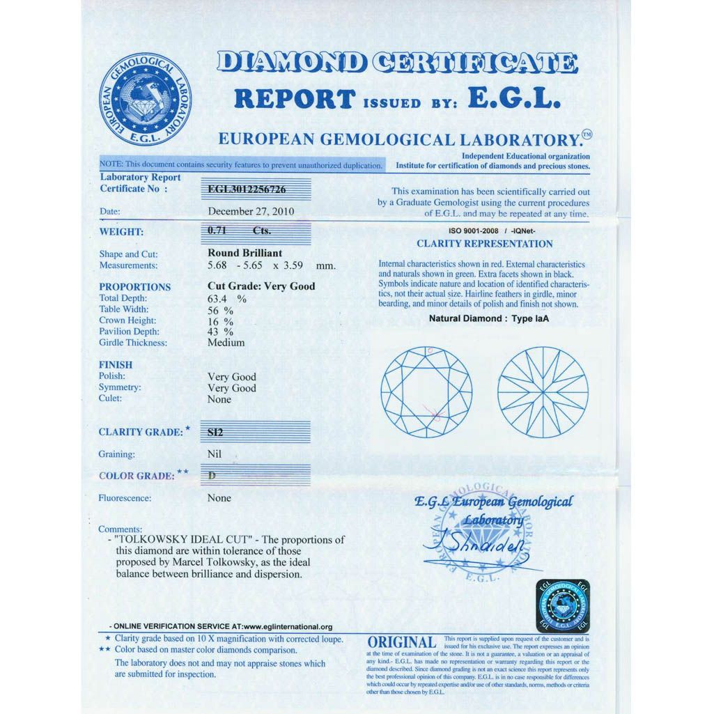 Diamond EGL Certified Round 0.71 ctw D,SI2 **|**|** 5.68x5.65x3.59mm;Cut Very Good; Polish Very Good; Symmetry Very Good; Fluo None; Depth 63.4%; Table 56% ; MSRP: $6108