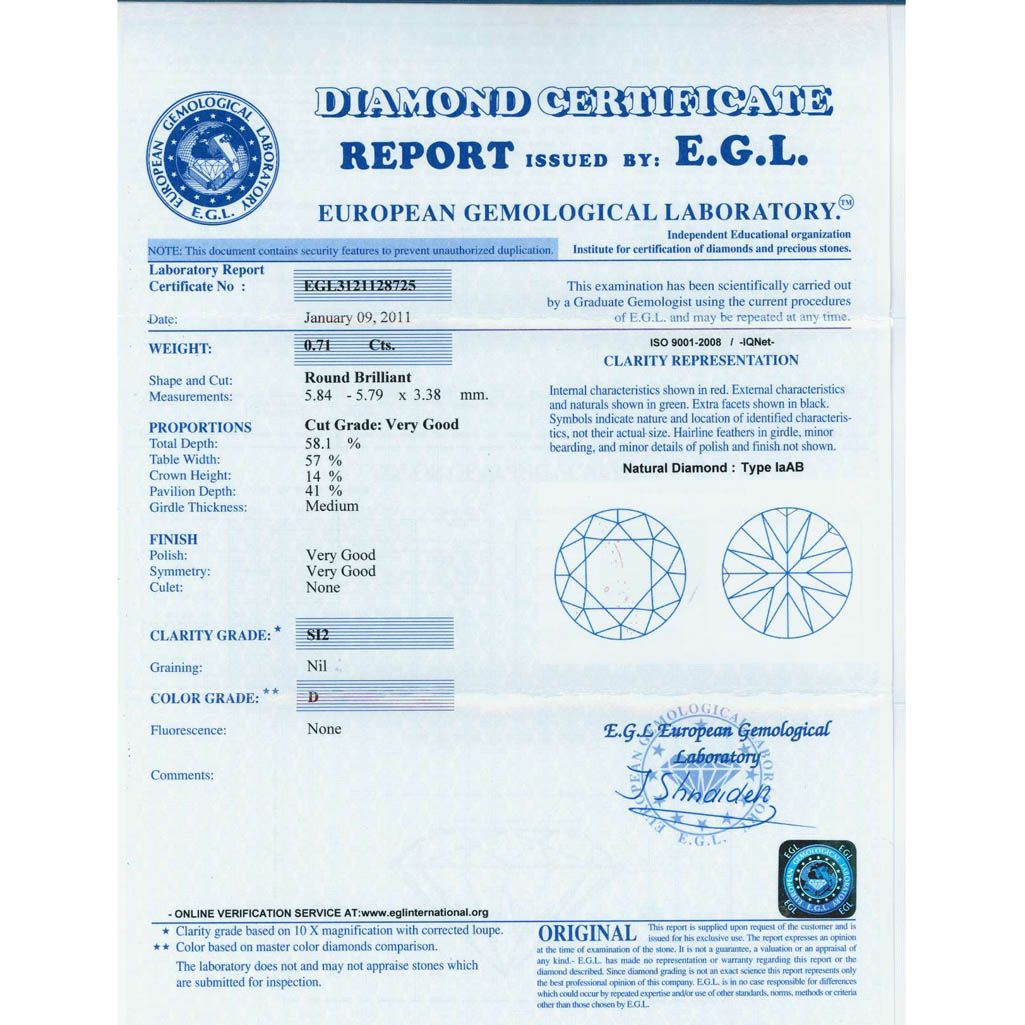 Diamond EGL Certified Round 0.71 ctw D,SI2 **|**|** 5.84x5.79x3.38mm;Cut Very Good; Polish Very Good; Symmetry Very Good; Fluo None; Depth 58.1%; Table 57% ; MSRP: $6108