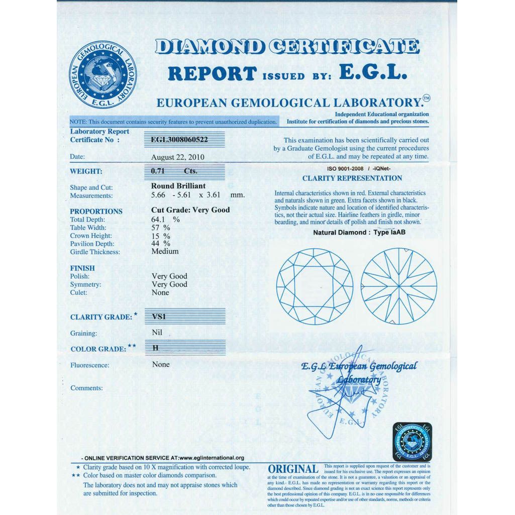 Diamond EGL Certified Round 0.71 ctw H,VS1 **|**|** 5.66x5.61x3.61mm;Cut Very Good; Polish Very Good; Symmetry Very Good; Fluo None; Depth 64.1%; Table 57% ; MSRP: $6540