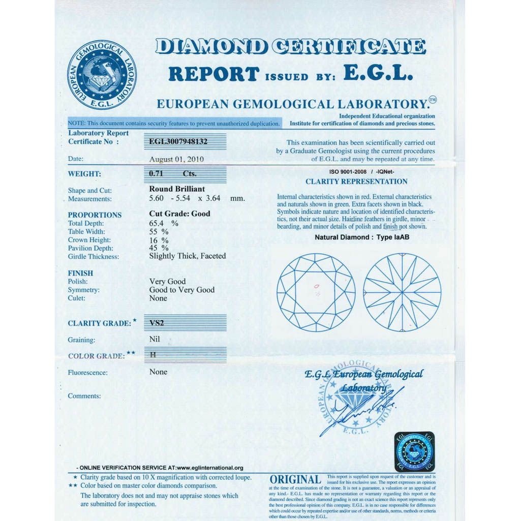 Diamond EGL Certified Round 0.71 ctw H,VS2 **|**|** 5.60x5.54x3.64mm;Cut Very Good; Polish Very Good; Symmetry Very Good; Fluo None; Depth 65.4%; Table 55% ; MSRP: $5724