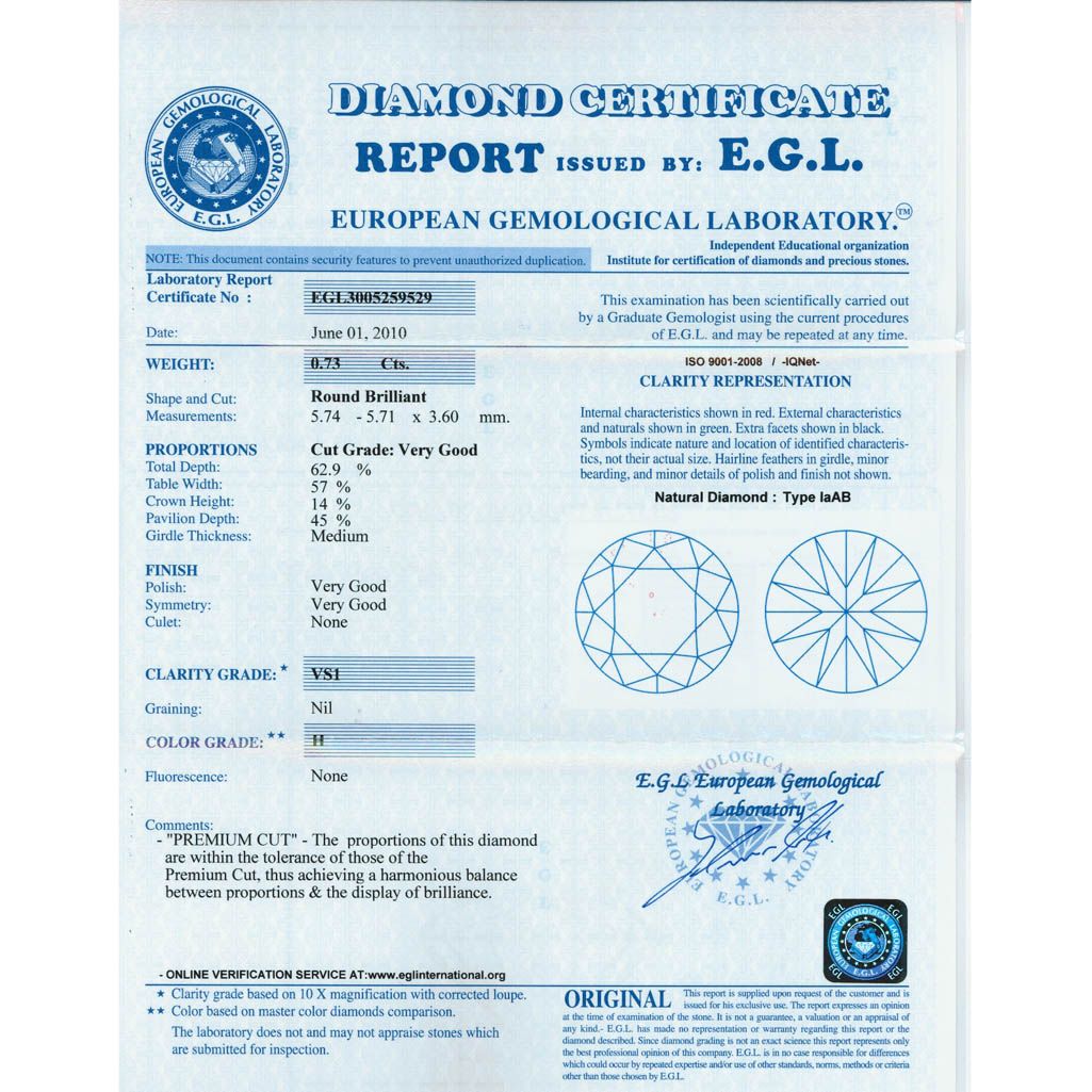 Diamond EGL Certified Round 0.73 ctw H,VS1 **|**|** 5.74x5.71x3.60mm;Cut Very Good; Polish Very Good; Symmetry Very Good; Fluo None; Depth 62.9%; Table 57% ; MSRP: $6272