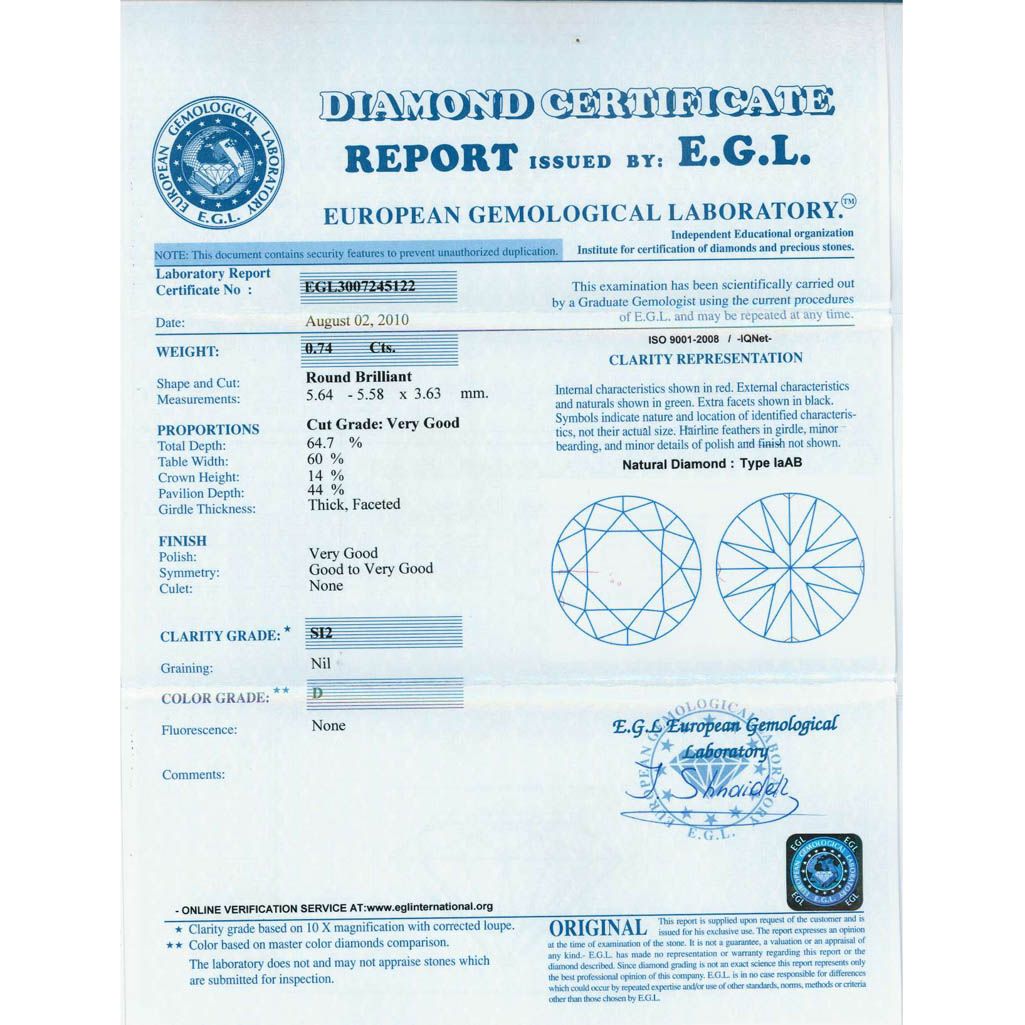 Diamond EGL Certified Round 0.74 ctw D,SI2 **|**|** 5.64x5.58x3.63mm;Cut Very Good; Polish Very Good; Symmetry Very Good; Fluo None; Depth 64.7%; Table 60% ; MSRP: $6364