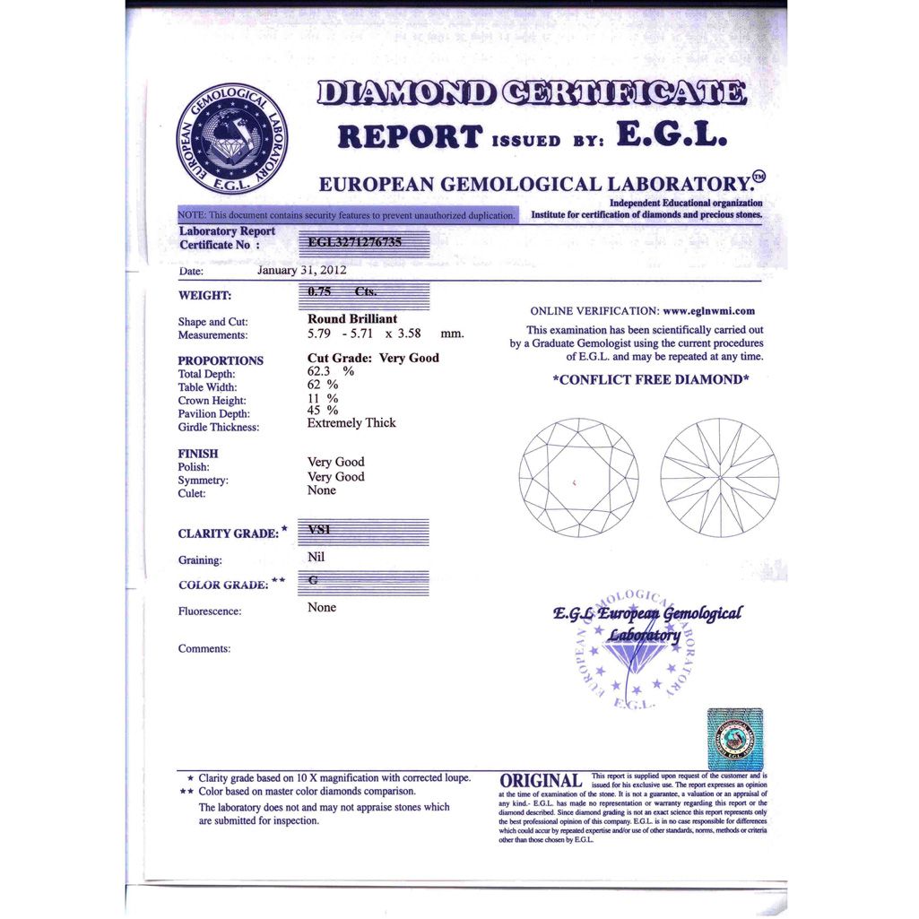 Diamond EGL Certified Round 0.75 ctw G, VS1 **|**|** 5.79x5.71x3.58mm;Cut Very Good; Polish Very Good; Symmetry Very Good; Fluo None; Depth 62.3%; Table 62% ; MSRP: $6580