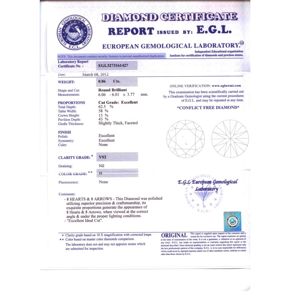 Diamond EGL Certified Round 0.86 ctw H, VS2 **|**|** 6.06x6.01x3.77mm;Cut Excellent; Polish Excellent; Symmetry Excellent; Fluo None; Depth 62.5%; table 58% ; MSRP: $6960
