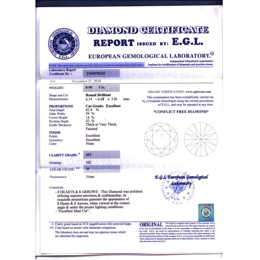 Diamond EGL Certified Round 0.90 ctw D, SI1 **|**|** 6.14x6.08x3.81mm;Cut Excellent; Polish Excellent; Symmetry Excellent; Fluo None; Depth 62.4%; table 59% ; MSRP: $12876