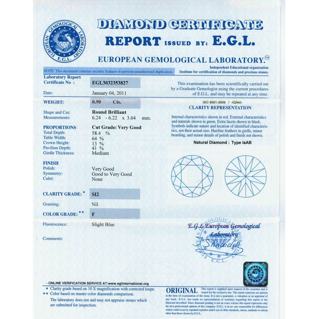 Diamond EGL Certified Round 0.90 ctw F,SI2 **|**|** 6.24x6.22x3.64mm;Cut Very Good; Polish Very Good; Symmetry Very Good; Fluo None; Depth 58.4%; Table 64% ; MSRP: $10216
