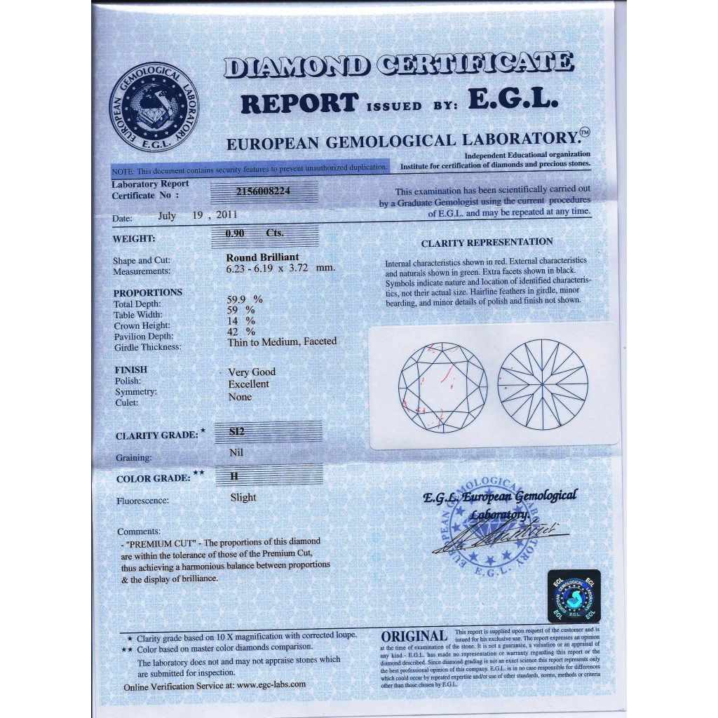 Diamond EGL Certified Round 0.90 ctw H, SI2 **|**|** 6.23x6.19x3.72mm;Cut Very Good; Polish Very Good; Symmetry Excellent; Fluo Slight; Depth 59.9%; Table 59% ; MSRP: $8820