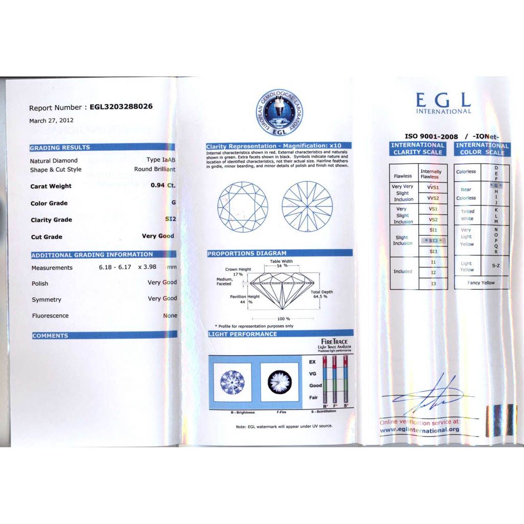 Diamond EGL Certified Round 0.94 ctw G,SI2 **|**|** 6.18x6.17x3.98mm;Cut Very Good; Polish Very Good; Symmetry Very Good; Fluo None; Depth 64.5%; Table 54% ; MSRP: $8564