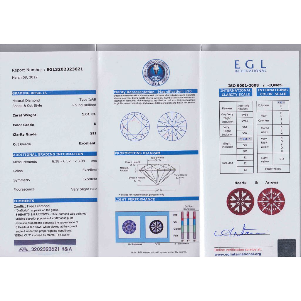 Diamond EGL Certified Round 1.01 ctw D,SI1 **|**|** 6.38x6.32x3.99mm;Cut Excellent; Polish Excellent; Symmetry Excellent; Fluo Very Slight Blue; Depth 62.8%; table 58% ; MSRP: $14592