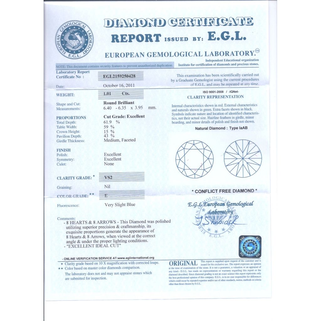 Diamond EGL Certified Round 1.01 ctw E, VS2 **|**|** 6.40x6.35x3.95mm;Cut Excellent; Polish Excellent; Symmetry Excellent; Fluo Very Slight Blue; Depth 61.9%; table 59% ; MSRP: $18580