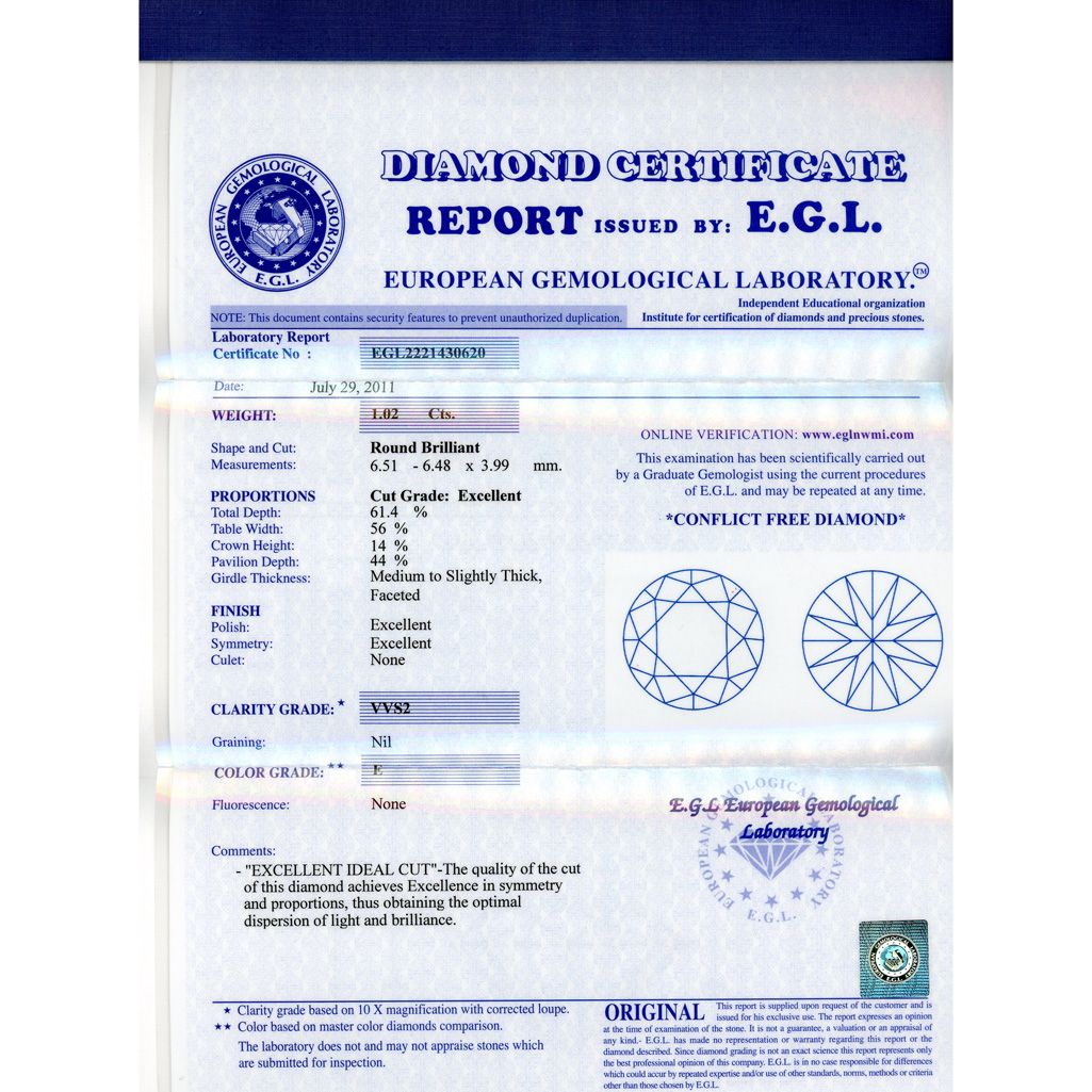 Diamond EGL Certified Round 1.02 ctw E, VVS2 **|**|** 6.51x6.48x3.99mm;Cut Excellent; Polish Excellent; Symmetry Excellent; Fluo None; Depth 61.4%; table 56% ; MSRP: $24932