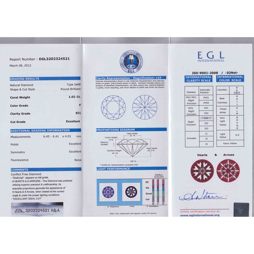 Diamond EGL Certified Round 1.02 ctw F, SI1 **|**|** 6.45x6.41x4.01mm;Cut Excellent; Polish Excellent; Symmetry Excellent; Fluo None; Depth 62.3%; table 57% ; MSRP: $14572