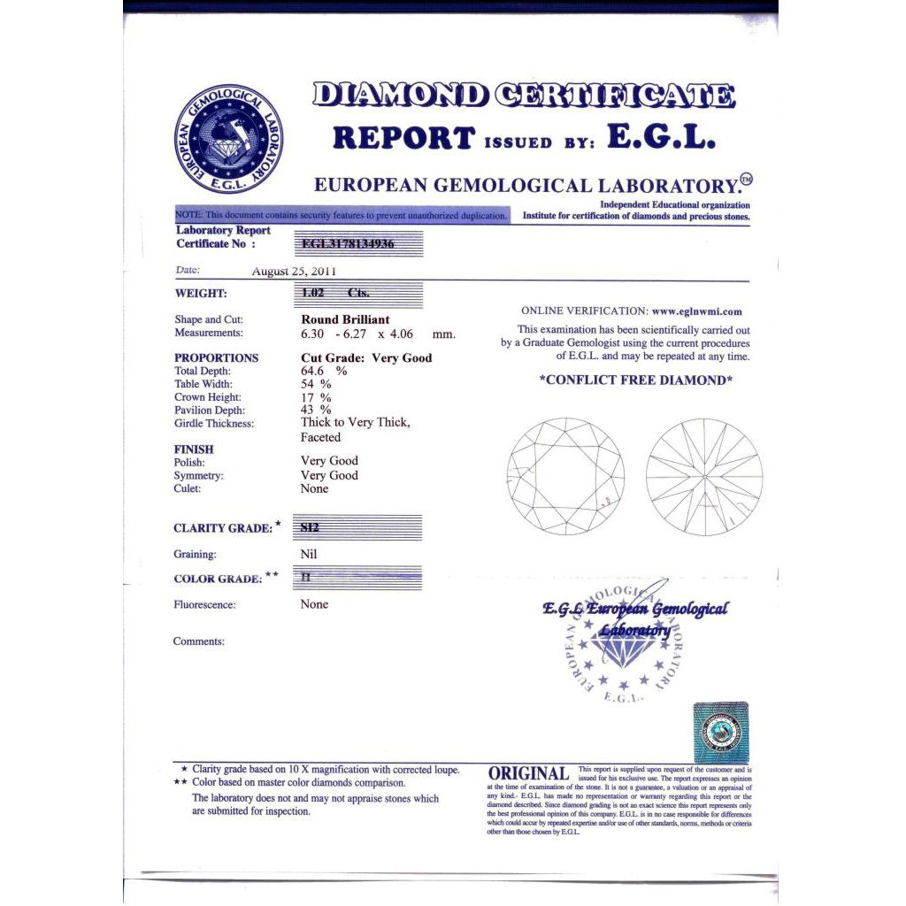 Diamond EGL Certified Round 1.02 ctw H, VS2 **|**|** 6.30x6.27x4.06mm;Cut Very Good; Polish Very Good; Symmetry Very Good; Fluo None; Depth 64.6%; Table 54% ; MSRP: $11504