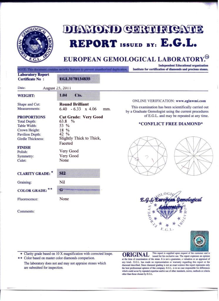 Diamond EGL Certified Round 1.04 ctw G, SI2 **|**|** 6.40x6.33x4.06mm;Cut Very Good; Polish Very Good; Symmetry Very Good; Fluo None; Depth 63.8%; Table 53% ; MSRP: $12388