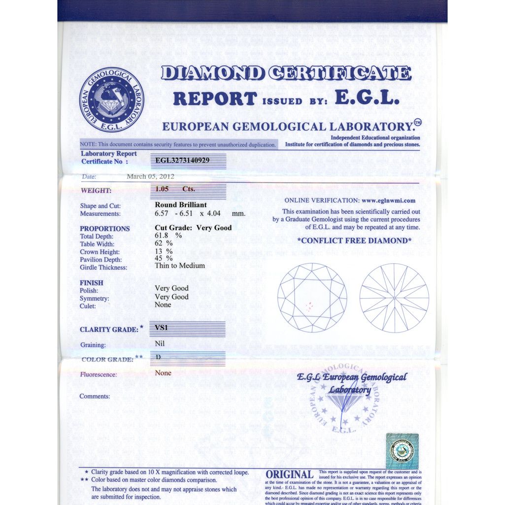 Diamond EGL Certified Round 1.05 ctw D,VSI **|**|** 6.57x6.51x4.04mm;Cut Very Good; Polish Very Good; Symmetry Very Good; Fluo None; Depth 61.8%; Table 62% ; MSRP: $25832