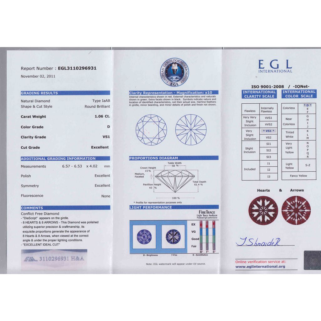 Diamond EGL Certified Round 1.06 ctw D, VS1 **|**|** 6.57x6.53x4.02mm;Cut Excellent; Polish Excellent; Symmetry Excellent; Fluo None; Depth 61.4%; table 58% ; MSRP: $28496