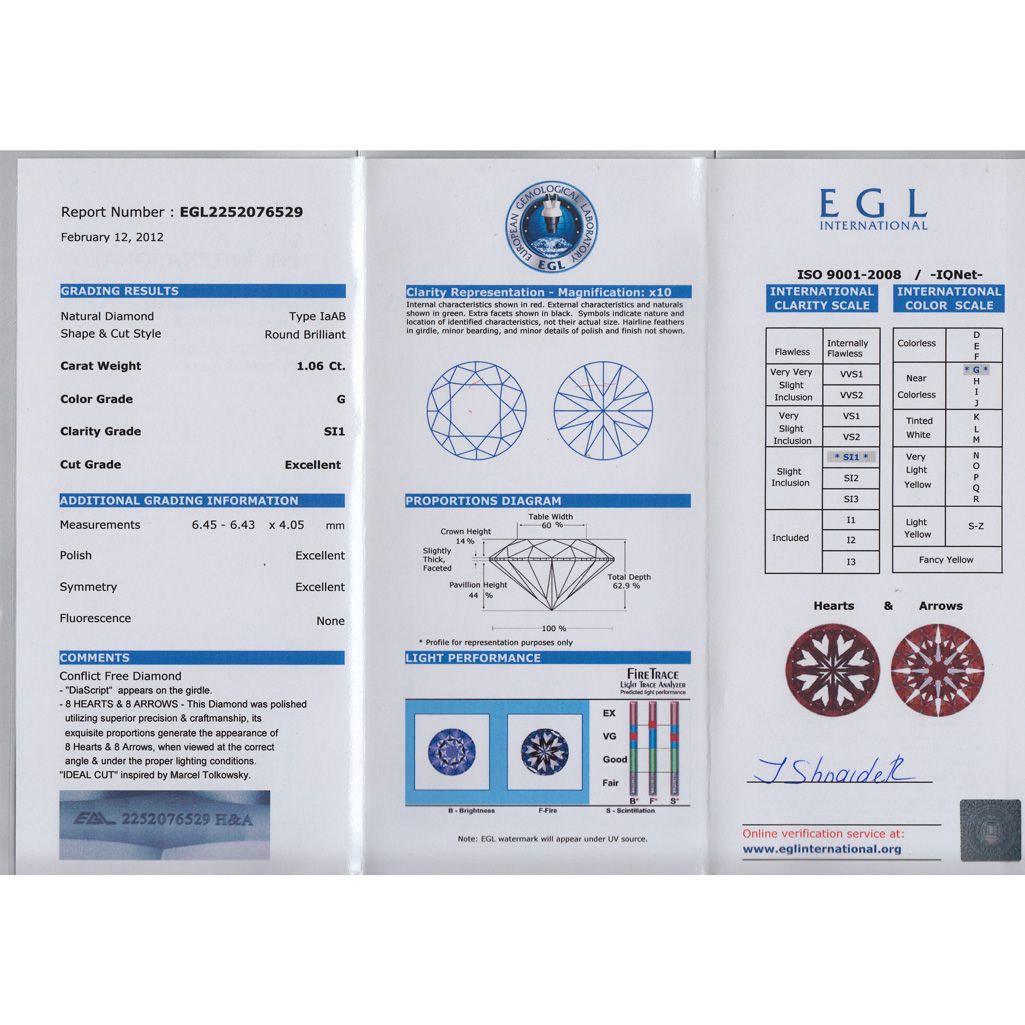 Diamond EGL Certified Round 1.06 ctw G, SI1 **|**|** 6.45x6.43x4.05mm;Cut Excellent; Polish Excellent; Symmetry Excellent; Fluo None; Depth 62.9%; table 60% ; MSRP: $14548