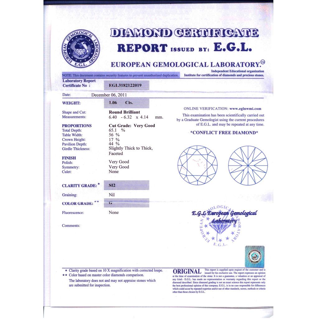 Diamond EGL Certified Round 1.06 ctw G, SI2 **|**|** 6.40x6.32x4.14mm;Cut Very Good; Polish Very Good; Symmetry Very Good; Fluo None; Depth 65.1%; Table 56% ; MSRP: $12096