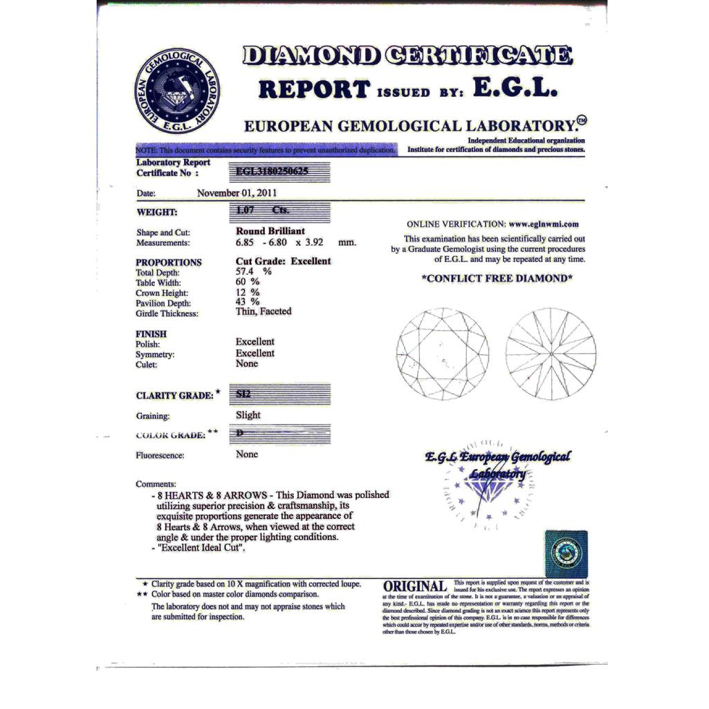 Diamond EGL Certified Round 1.07 ctw D, SI2 **|**|** 6.85x6.80x3.92mm;Cut Excellent; Polish Excellent; Symmetry Excellent; Fluo None; Depth 57.4%; table 60% ; MSRP: $13868