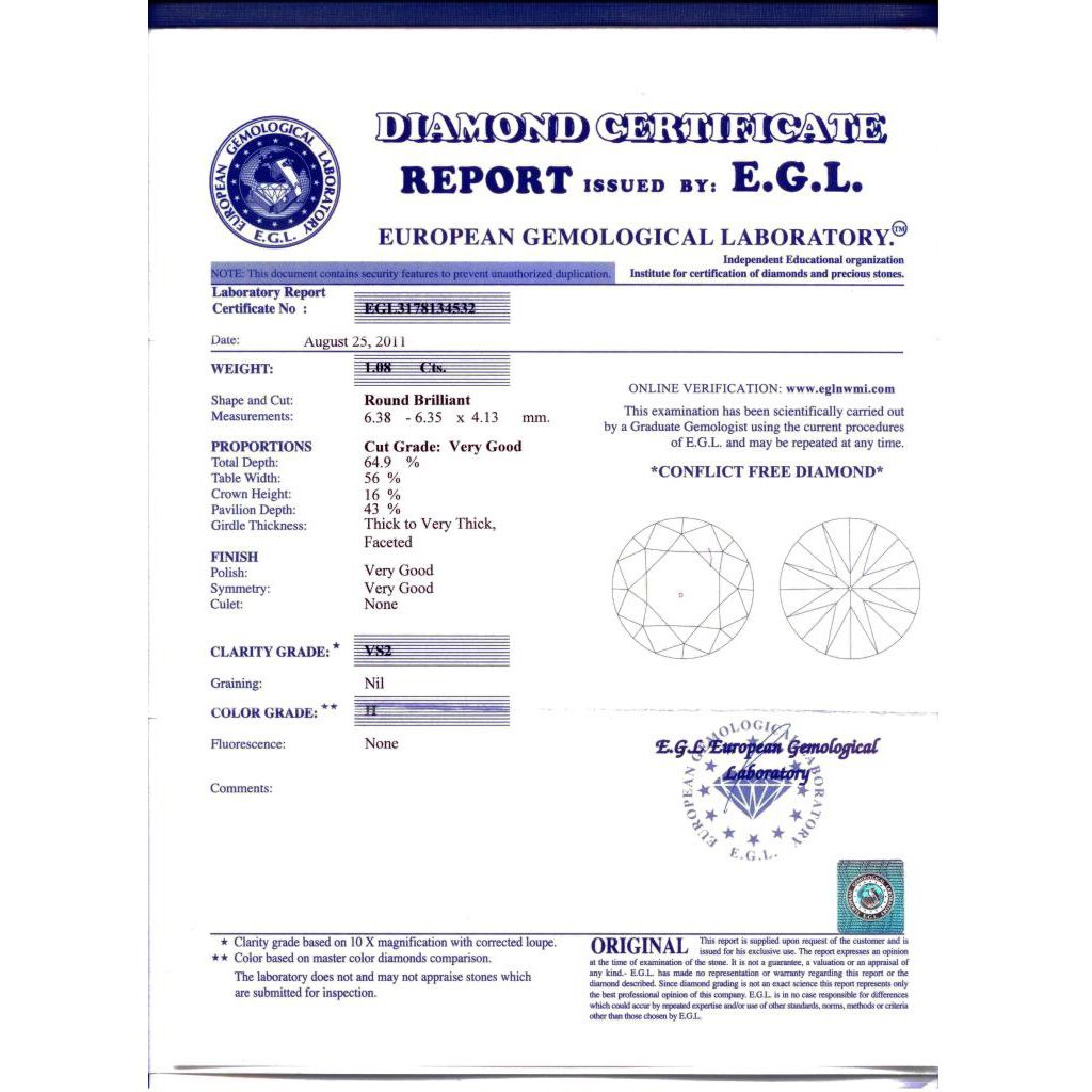 Diamond EGL Certified Round 1.08 ctw H, VS2 **|**|** 6.38x6.35x4.13mm;Cut Very Good; Polish Very Good; Symmetry Very Good; Fluo None; Depth 64.9%; Table 56% ; MSRP: $15196