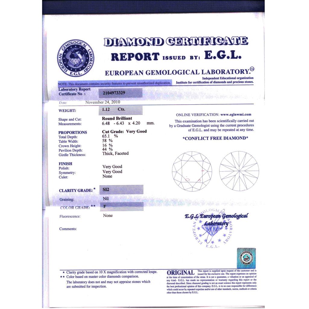 Diamond EGL Certified Round 1.12 ctw F, SI2 **|**|** 6.48x6.43x4.20mm;Cut Very Good; Polish Very Good; Symmetry Very Good; Fluo None; Depth 62.1%; Table 58% ; MSRP: $13104