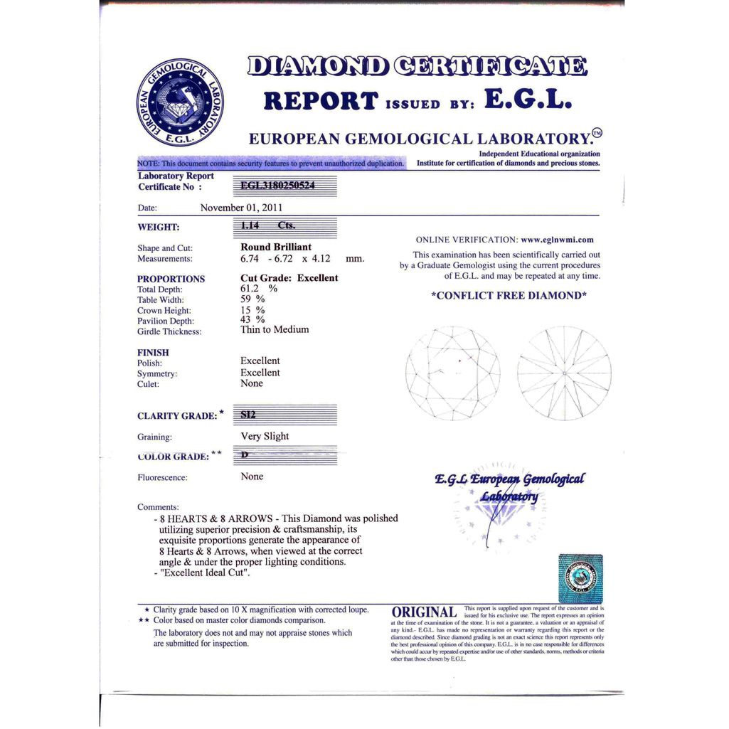 Diamond EGL Certified Round 1.14 ctw D, SI2 **|**|** 6.74x6.72x4.12mm;Cut Excellent; Polish Excellent; Symmetry Excellent; Fluo None; Depth 61.2%; table 59% ; MSRP: $14776