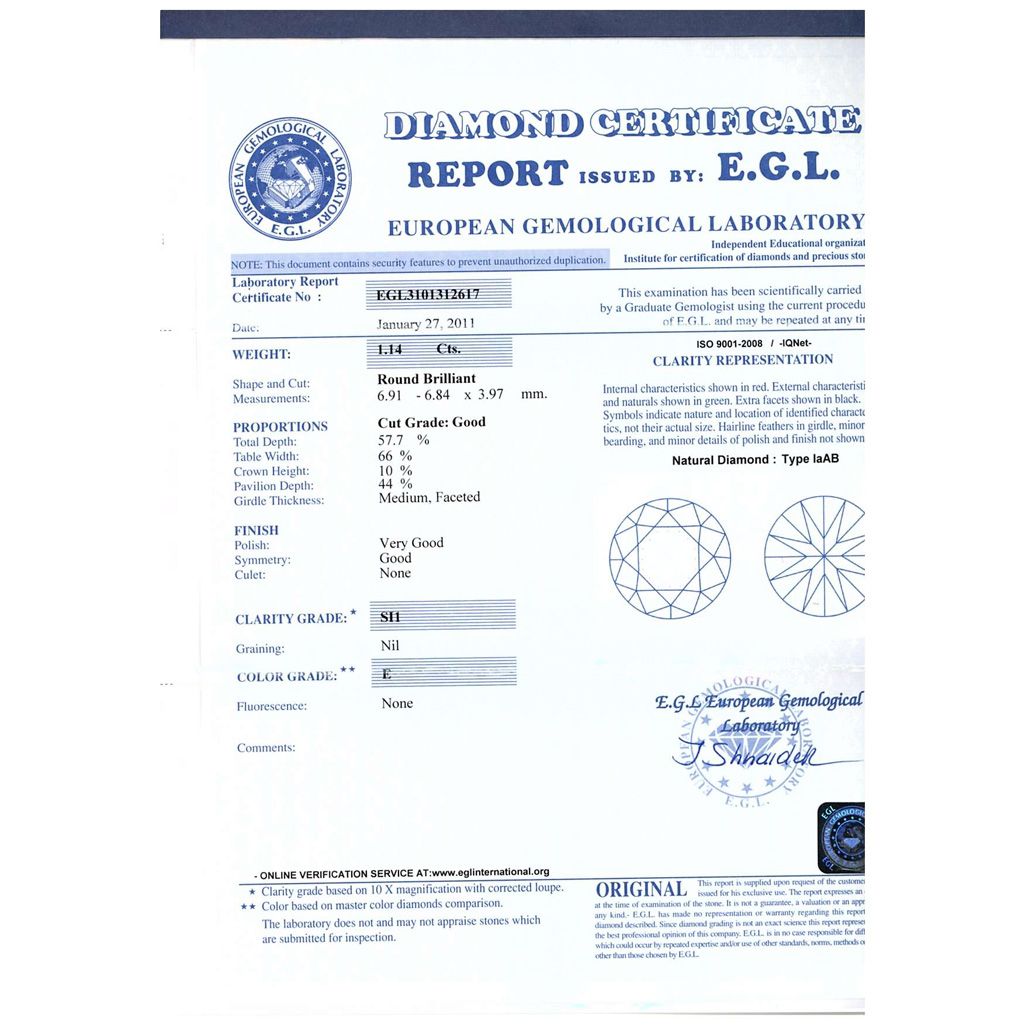Diamond EGL Certified Round 1.14 ctw E, SI1 **|**|** 6.91x6.84x3.97mm;Cut Very Good; Polish Very Good; Symmetry Very Good; Fluo NONE; Depth 57.7%; Table 66% ; MSRP: $14336