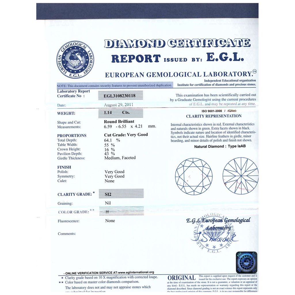 Diamond EGL Certified Round 1.14 ctw H, SI2 **|**|** 6.59x6.55x4.21mm;Cut Very Good; Polish Very Good; Symmetry Very Good; Fluo None; Depth 64.1%; Table 55% ; MSRP: $12804