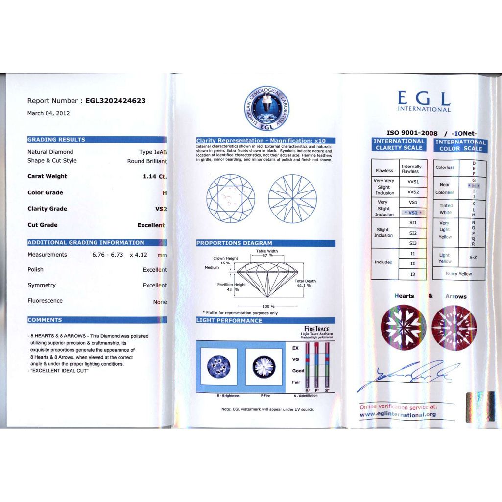 Diamond EGL Certified Round 1.14 ctw H, VS2 **|**|** 6.76x6.73x4.12mm;Cut Excellent; Polish Excellent; Symmetry Excellent; Fluo None; Depth 61.1%; table 57% ; MSRP: $15528