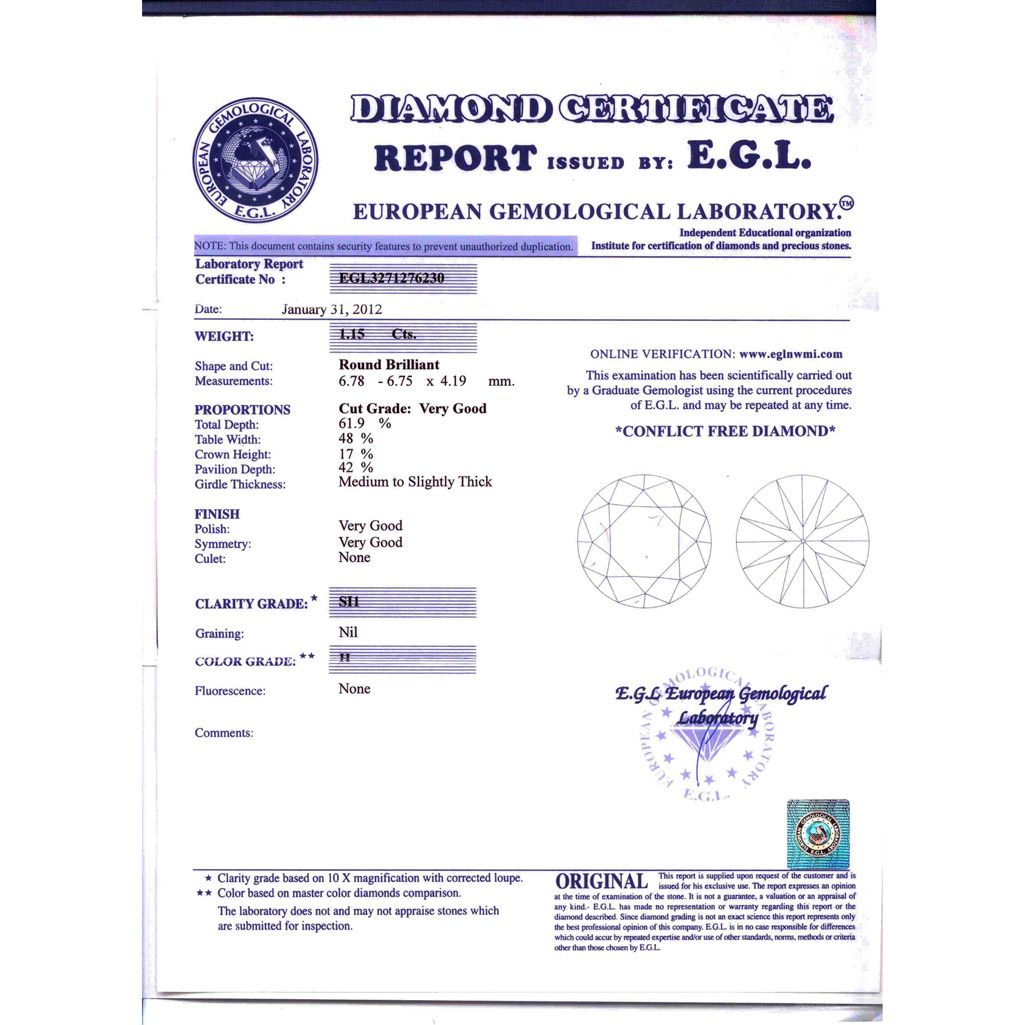 Diamond EGL Certified Round 1.15 ctw H, SI1 **|**|** 6.78x6.72x4.19mm;Cut Excellent; Polish Excellent; Symmetry Excellent; Fluo None; Depth 61.9%; table 48% ; MSRP: $12240
