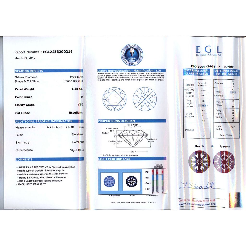 Diamond EGL Certified Round 1.18 ctw H, VS2 **|**|** 6.77x6.73x4.18mm;Cut Excellent; Polish Excellent; Symmetry Excellent; Fluo Slight Blue; Depth 61.9%; table 56% ; MSRP: $16788