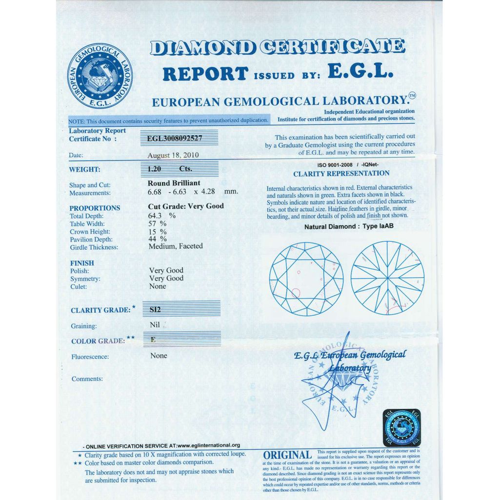 Diamond EGL Certified Round 1.20 ctw E, SI2 **|**|** 6.68x6.63x4.28mm;Cut Very Good; Polish Very Good; Symmetry Very Good; Fluo None; Depth 64.3%; Table 57% ; MSRP: $14176
