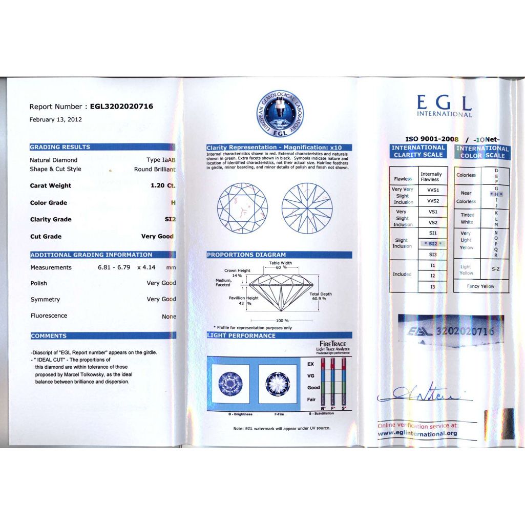 Diamond EGL Certified Round 1.20 ctw H, SI2 **|**|** 6.81x6.79x4.14mm;Cut Very Good; Polish Very Good; Symmetry Very Good; Fluo None; Depth 60.9%; Table 60% ; MSRP: $12904