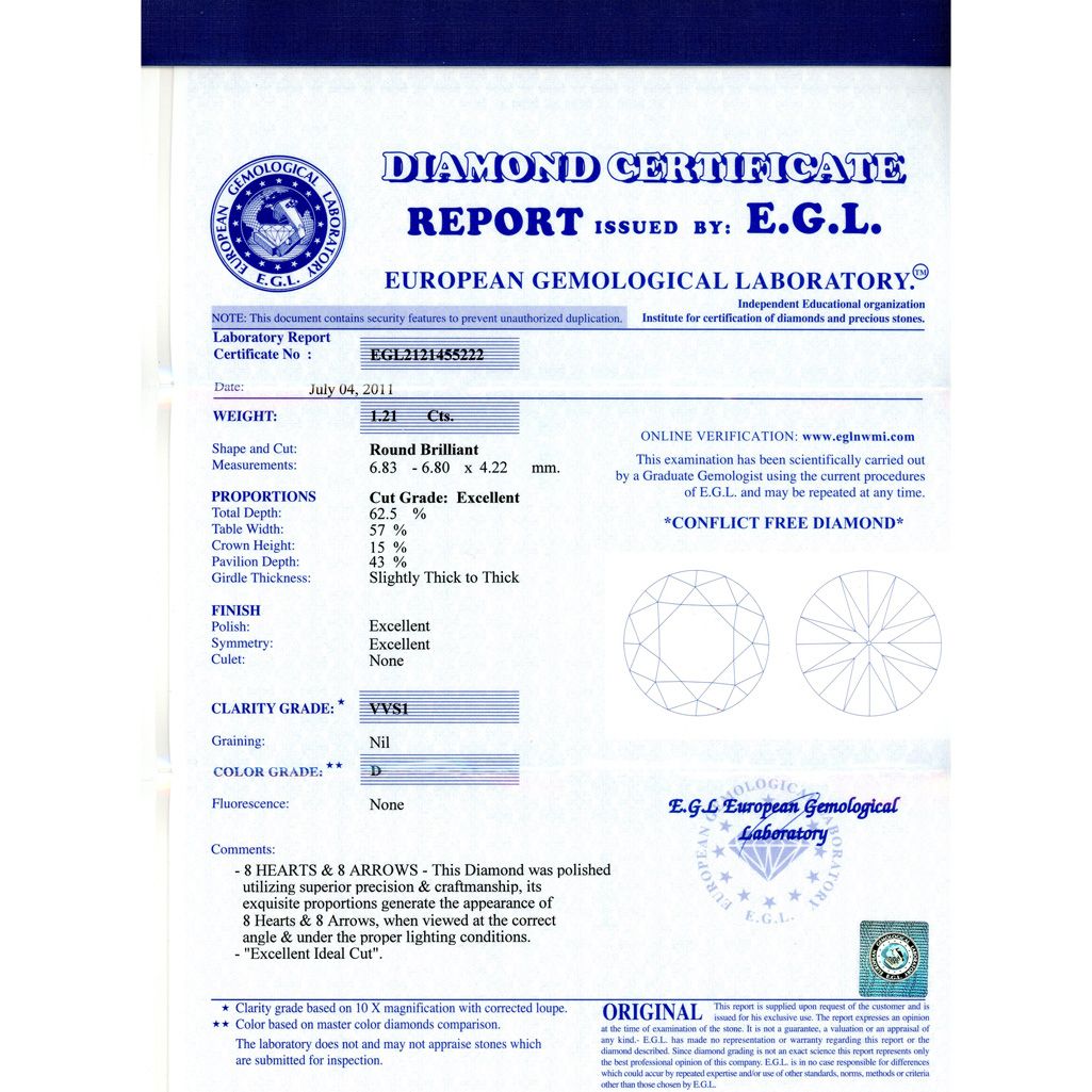 Diamond EGL Certified Round 1.21 ctw D,VVS1 **|**|** 6.83x6.80x4.22mm;Cut Excellent; Polish Excellent; Symmetry Excellent; Fluo None; Depth 62.5%; table 57% ; MSRP: $42808