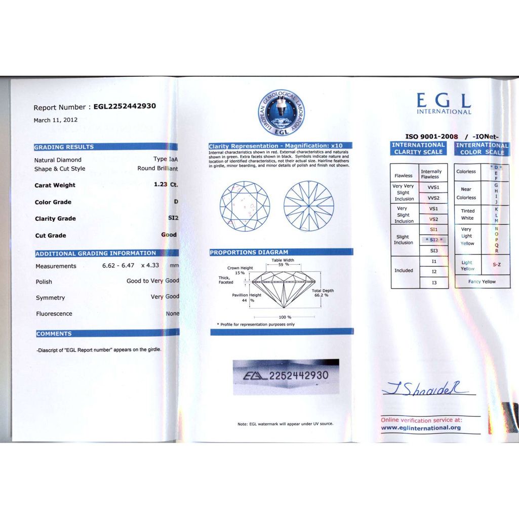 Diamond EGL Certified Round 1.23 ctw D, SI2 **|**|** 6.62x6.47x4.33mm;Cut Very Good; Polish Very Good; Symmetry Very Good; Fluo None; Depth 66.2%; Table 59% ; MSRP: $15872