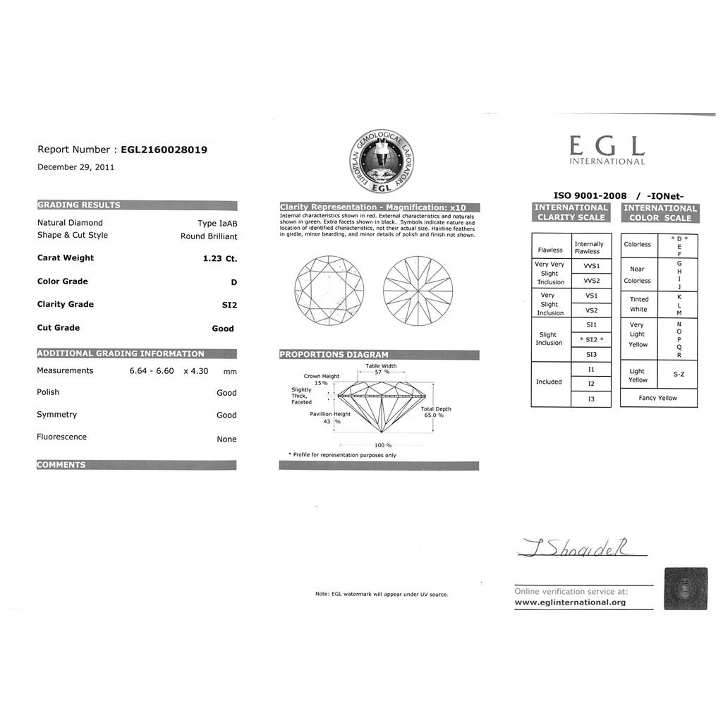 Diamond EGL Certified Round 1.23 ctw D, SI2 **|**|** 6.64x6.60x4.30mm;Cut Very Good; Polish Very Good; Symmetry Very Good; Fluo NONE; Depth 65%; Table 57% ; MSRP: $14100