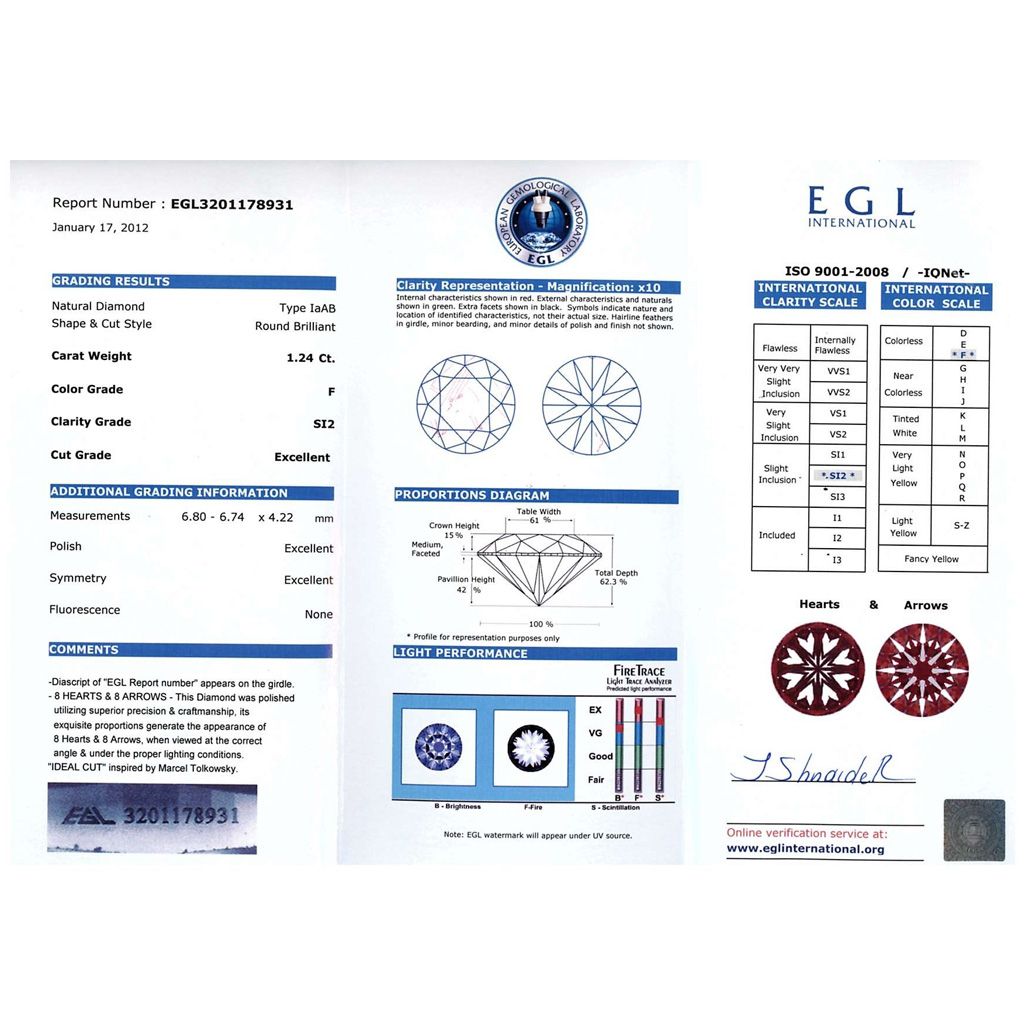 Diamond EGL Certified Round 1.24 ctw F, SI2 **|**|** 6.80x6.74x4.22mm;Cut Excellent; Polish Excellent; Symmetry Excellent; Fluo None; Depth 62.3%; table61% ; MSRP: $14444