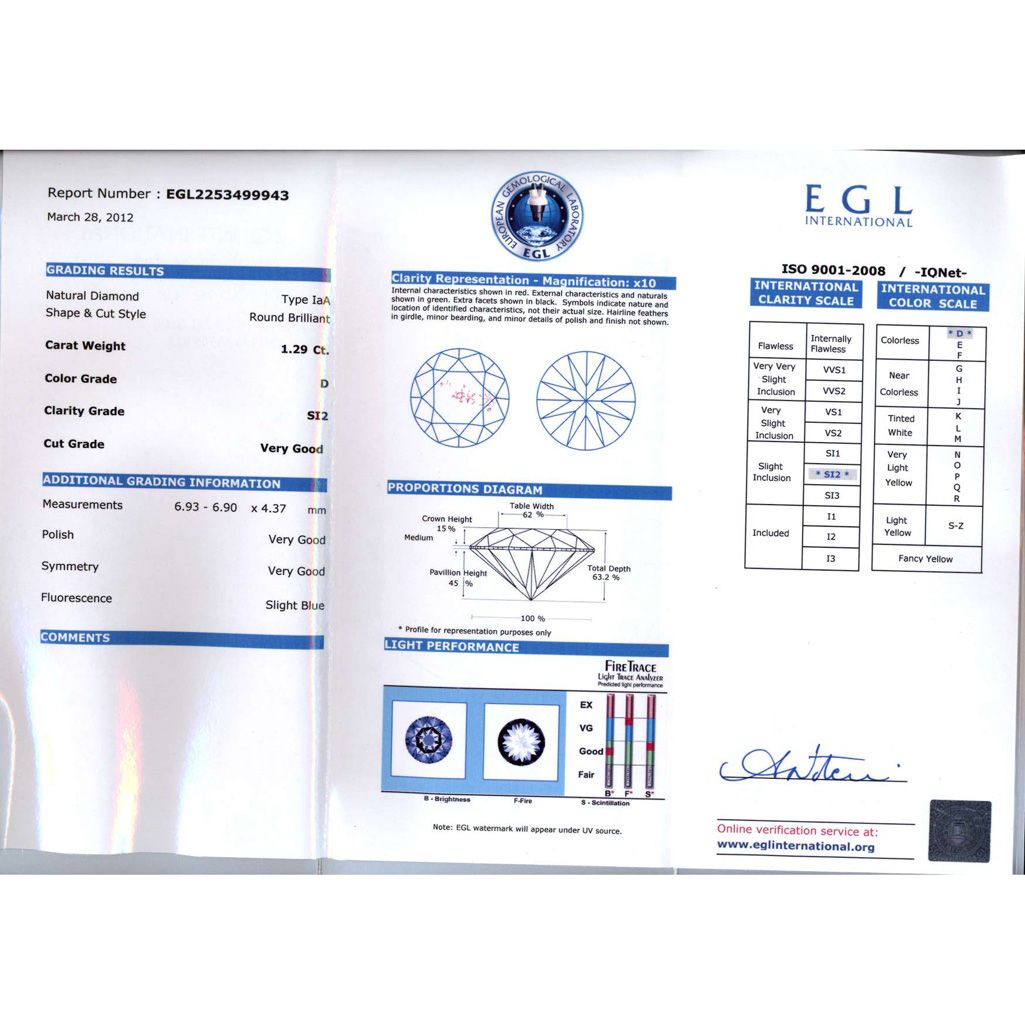 Diamond EGL Certified Round 1.29 ctw D, SI2 **|**|** 6.93X6.90X4.37mm;Cut Very Good; Polish Very Good; Symmetry Very Good; Fluo Slight Blue; Depth 63.2%; Table 62% ; MSRP: $14044