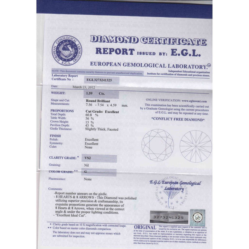 Diamond EGL Certified Round 1.59 ctw G, VS2 **|**|** 7.56x7.54x4.59mm;Cut Excellent; Polish Excellent; Symmetry Excellent; Fluo None; Depth 60.8%; table56% ; MSRP: $33484