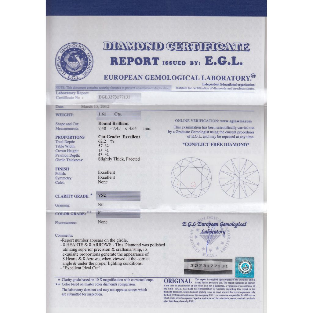 Diamond EGL Certified Round 1.61 ctw F, VS2 **|**|** 7.48x7.45x4.64mm;Cut Excellent; Polish Excellent; Symmetry Excellent; Fluo None; Depth 62.2%; table57% ; MSRP: $37384