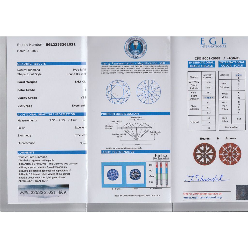 Diamond EGL Certified Round 1.63 ctw E, VS2 **|**|** 7.56x7.53x4.67mm;Cut Excellent; Polish Excellent; Symmetry Excellent; Fluo None; Depth 61.8%; table57% ; MSRP: $45068