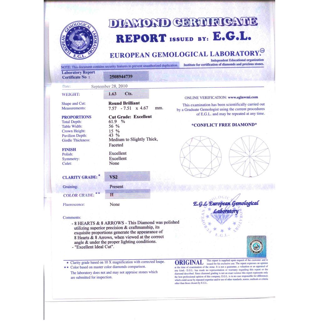 Diamond EGL Certified Round 1.63 ctw H, VS2 **|**|** 7.57x7.51x4.67mm;Cut Excellent; Polish Excellent; Symmetry Excellent; Fluo None; Depth 61.9%; table56% ; MSRP: $30952