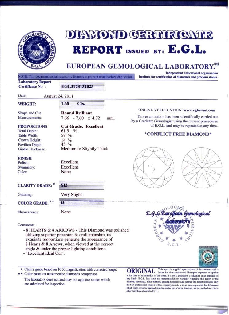 Diamond EGL Certified Round 1.68 ctw D, SI2 **|**|** 7.66x7.60x4.72mm;Cut Excellent; Polish Excellent; Symmetry Excellent; Fluo None; Depth 61.9%; table59% ; MSRP: $26808