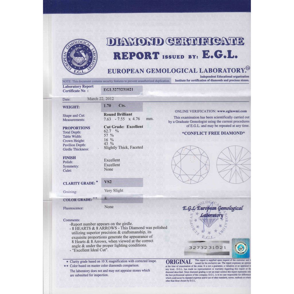 Diamond EGL Certified Round 1.70 ctw E, VS2 **|**|** 7.63x7.55x4.76mm;Cut Excellent; Polish Excellent; Symmetry Excellent; Fluo None; Depth 62.7%; table57% ; MSRP: $47980
